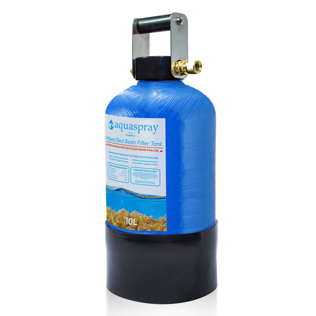 Give your customers a streak free shine with the use of our portable 3 gallon Resin Tank, designed to deliver spot-free rinsing results. This compact, 3-gallon deionizing tank ensures a pristine finish on vehicles by providing water that leaves no streaks or residues. Crafted from durable Fiberglass Reinforced Polyester, the tank comes equipped with two 5L bags of mixed resin for effective water purification. It also features standard 3/4'' NH thread connectors, a metal carry handle, Teflon tape for secure, leak-proof setups, and a blocking head for straightforward use. This tank is a must-have for auto detailers seeking to maintain impeccable cleanliness with efficiency. We have also included an expanding hose and adjustable sprayer as well as a TDS meter.