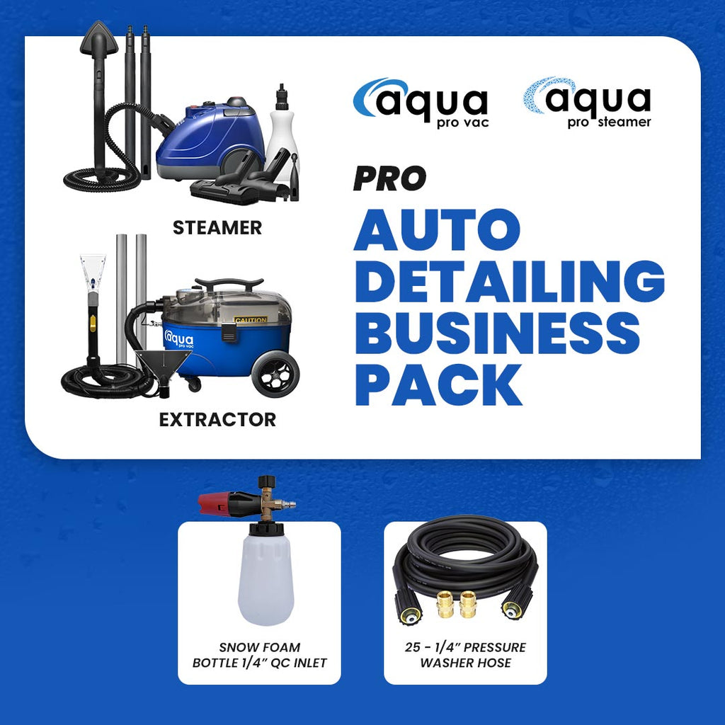 Introducing the Auto Detailing Business Start-Up Package: Pro, the business start-up package designed specifically for auto detailers and car enthusiasts. This starter or upgrade package includes high-quality cleaning equipment and accessories to help you achieve professional-level results. It comes with a carpet/upholstery extractor, portable steamer, 25-foot pressure washer hose, and a snow foam bottle. These tools will allow you to clean every inch of your customers' vehicles' interior and exterior with ease and efficiency. Whether you want to start your own auto detailing business or simply take your hobby to the next level, this Auto Detailing Business Package is the perfect choice for you.